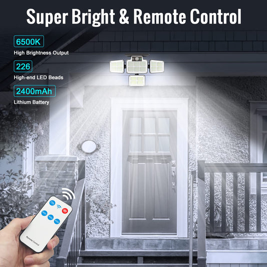 Solar Light Outdoor with Motion Sensor, Tiokkss Security Lights with Remote Control 4 Rotatable Heads 228 LEDs 7000K IP65 Waterproof Flood Lights for Garage Yard Garden (1Pack)