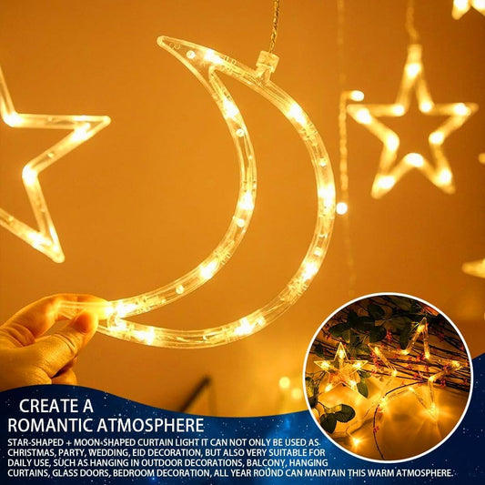 Tiokkss Ramadan Decorations 3.5M Curtain Lights, Stars and Moon Window Ramadan Lights 8 Modes USB and Battery Powered, 138 LED Indoor Outdoor Night Light for Ramadan Home Decoration Party (Warm White)